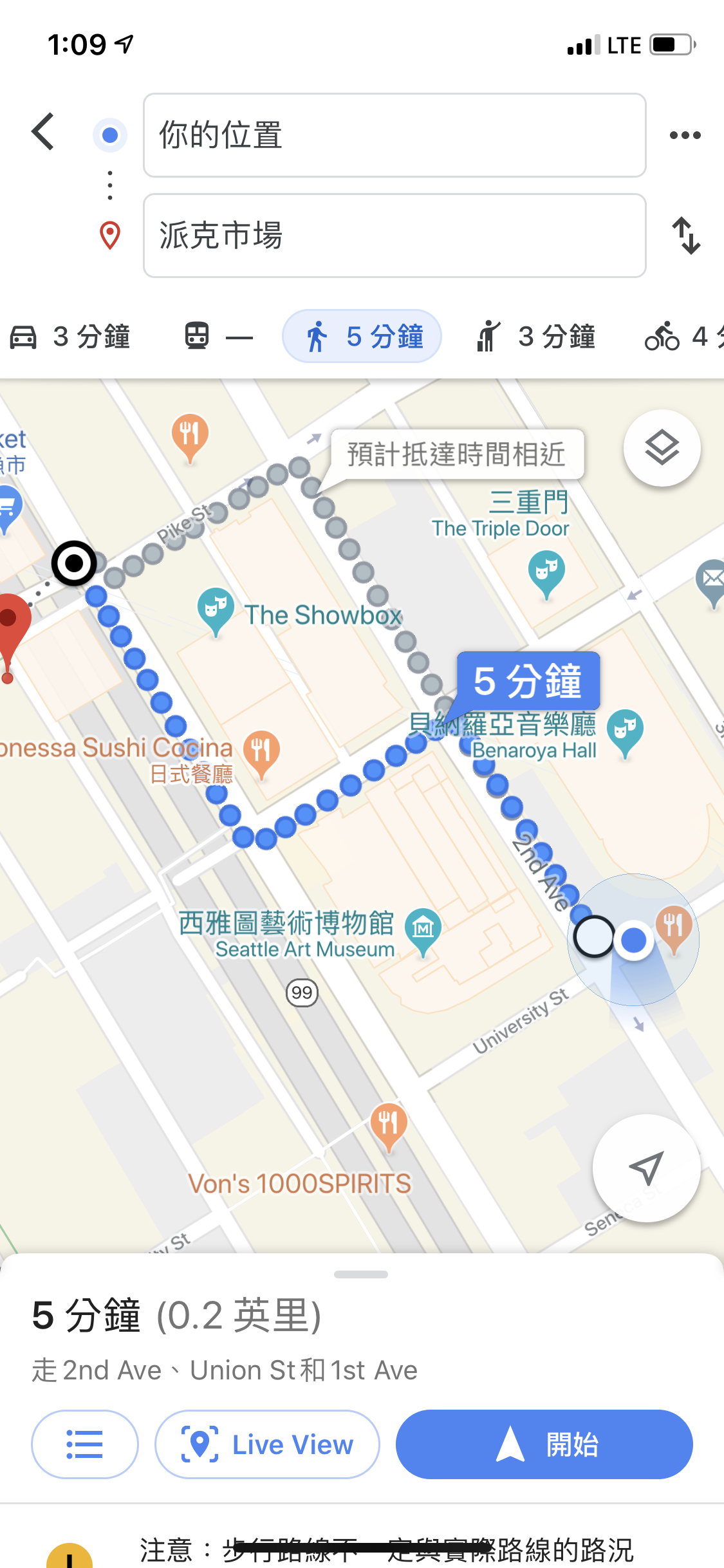 鏡頭回到西雅圖機場,在機場到處可見清楚的輕軌標示,抵達輕軌售票機前我們購買了一日票 (One Day/Round Trip) 票價是US$6,當日無限搭乘,但不能搭乘公車。觀察了一下輕軌的內裝跟台灣捷運一樣乾淨,搭乘起來很舒服,所停靠站會經過一些熱門景點,很適合第一次拜訪西雅圖的遊客們搭乘。因為輕軌行駛的方向只有兩種 往北N (University of Washington) 或 往南S (Angle Lake),按照google map的路線規劃,我們由西雅圖機場站 (SeaTac/Airport)直接搭乘往北方向,並於 University Street 站下車,再步行五分鐘至派克市場,前後車程約50分鐘。