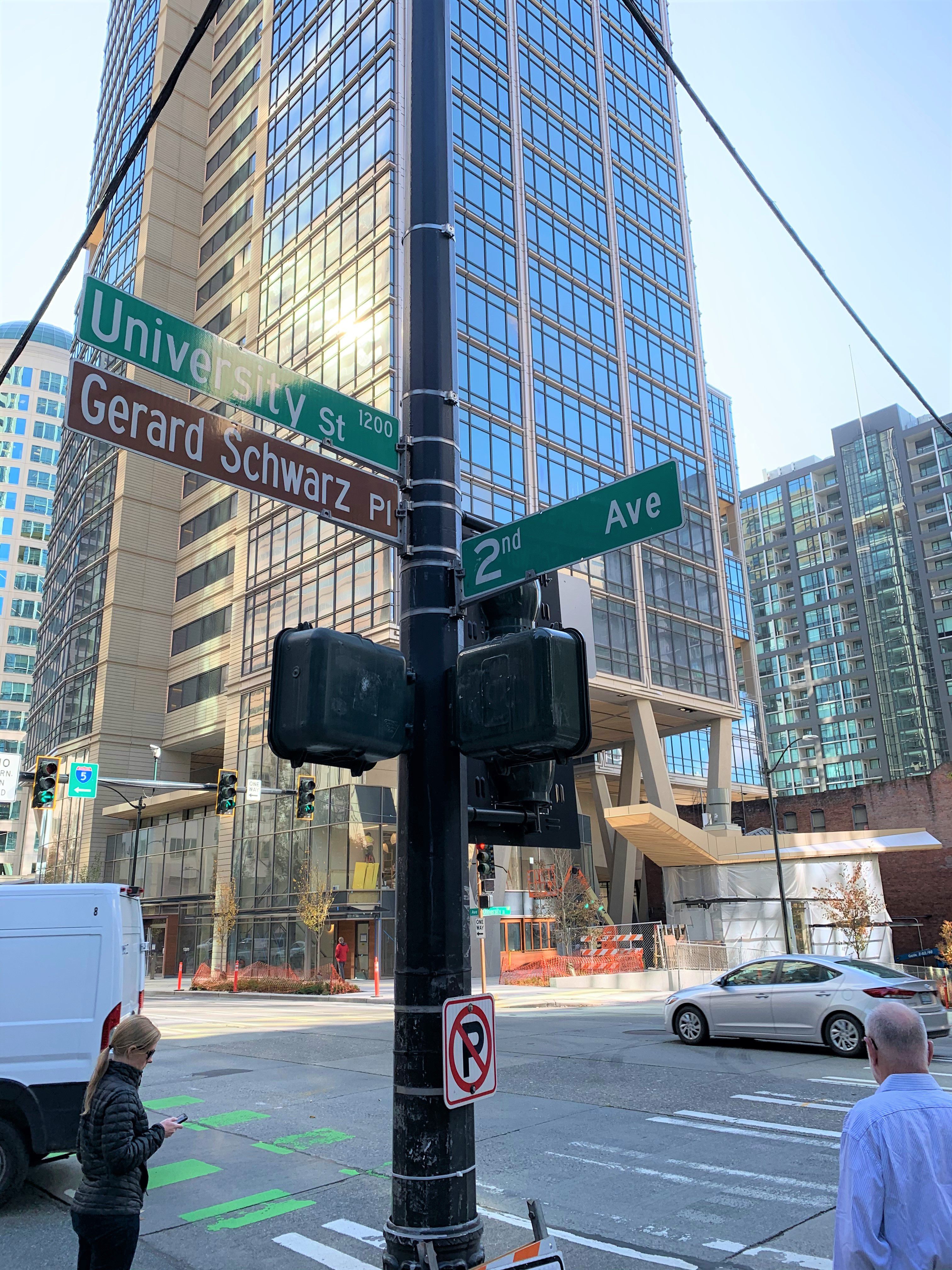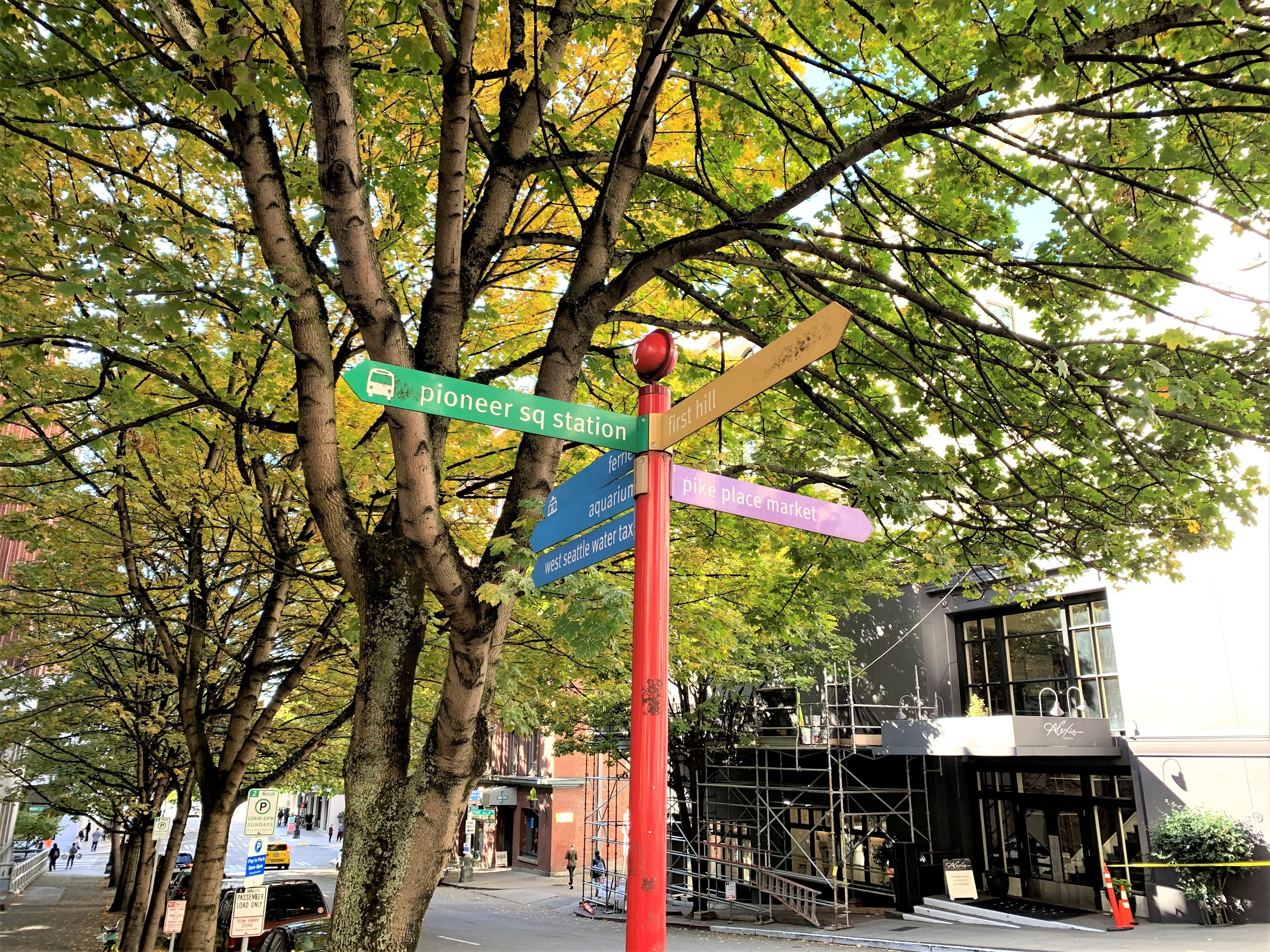 抵達University Street站時,我們靠著google map的路線規劃步行約五分鐘路程(事實證明搭到WestLake比較快),西雅圖當時的季節正泛著濃濃秋意,微風吹落片片紅色楓葉,上坡行的街道走起來比較費力,不過在這寒冷的天氣裡,動一動比較不會感覺冷,當時的溫度是9度。