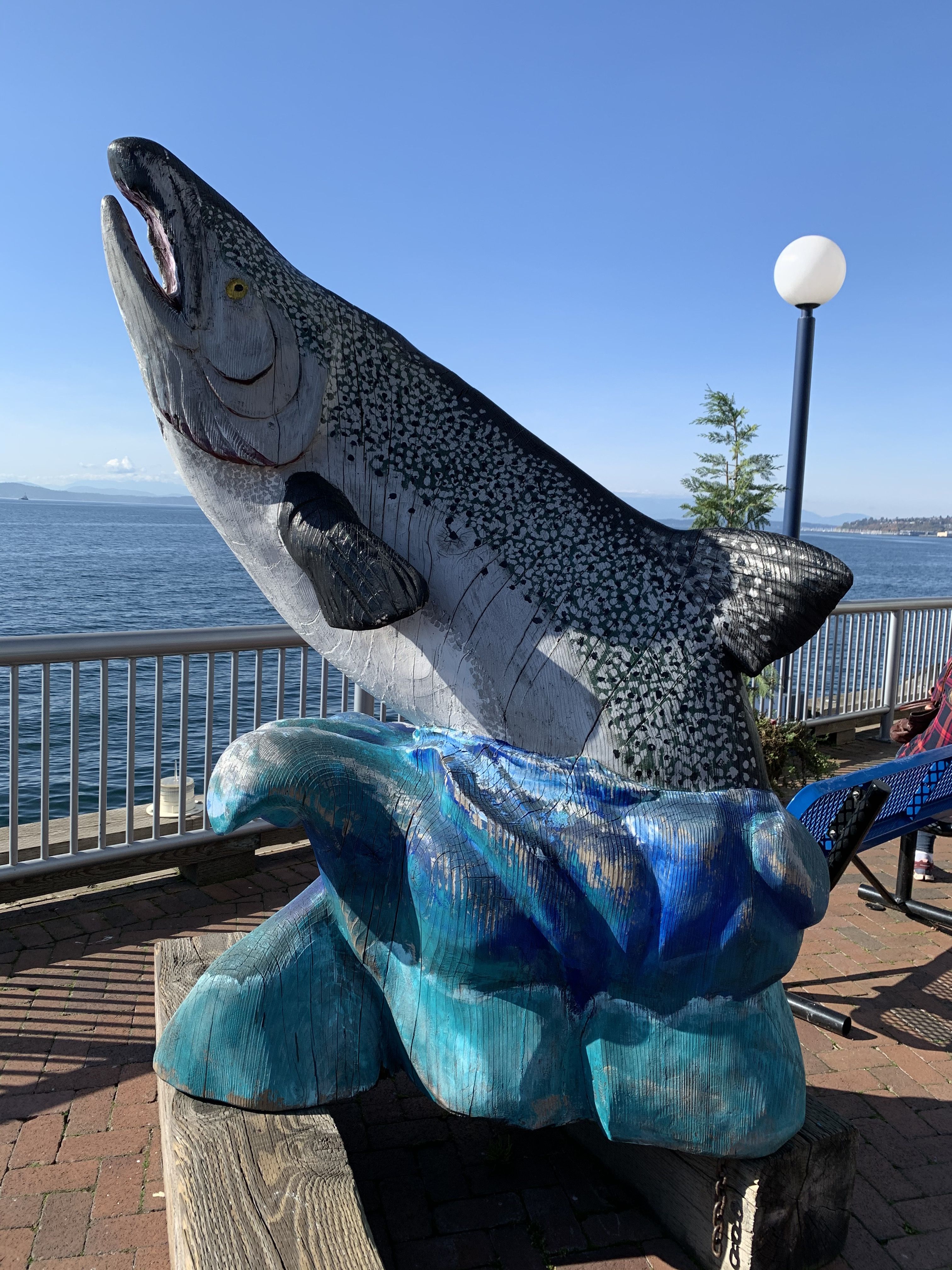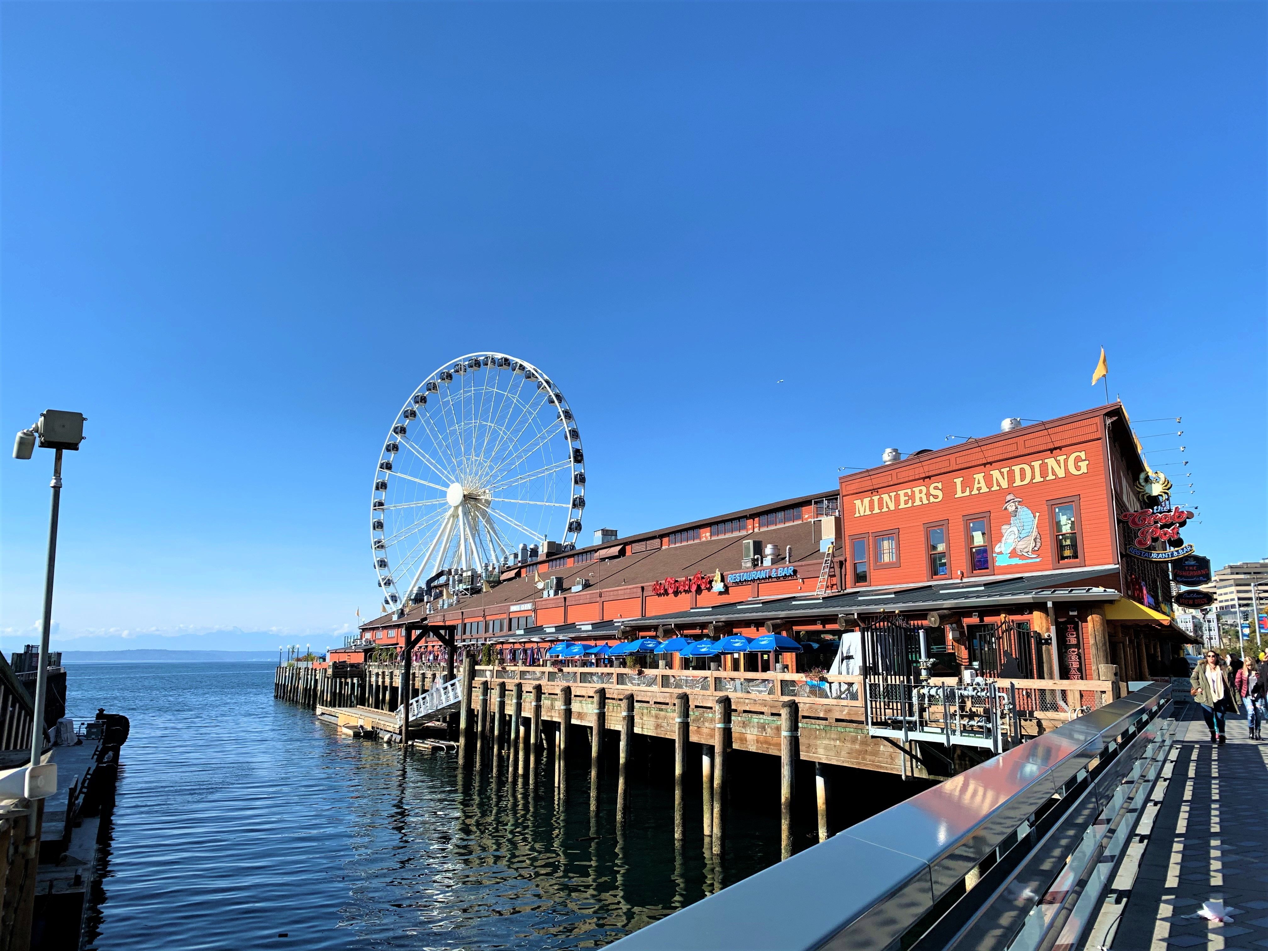 這個景點也是在派克市場附近,摩天輪位於伊洛特港的碼頭,當日陽光照射著湛藍海面,摩天輪上在太陽底下反射出銀白色的光,一旁碼頭的紅色商場建築,顏色鮮艷對比讓整個畫面非常的迷人。我們夫妻倆只是走馬看花並沒有搭上摩天輪眺望西雅圖這座城市,許多遊客也是肩並肩站在碼頭欄杆旁欣賞著一望無際的海面,趁天氣晴朗搶拍照。