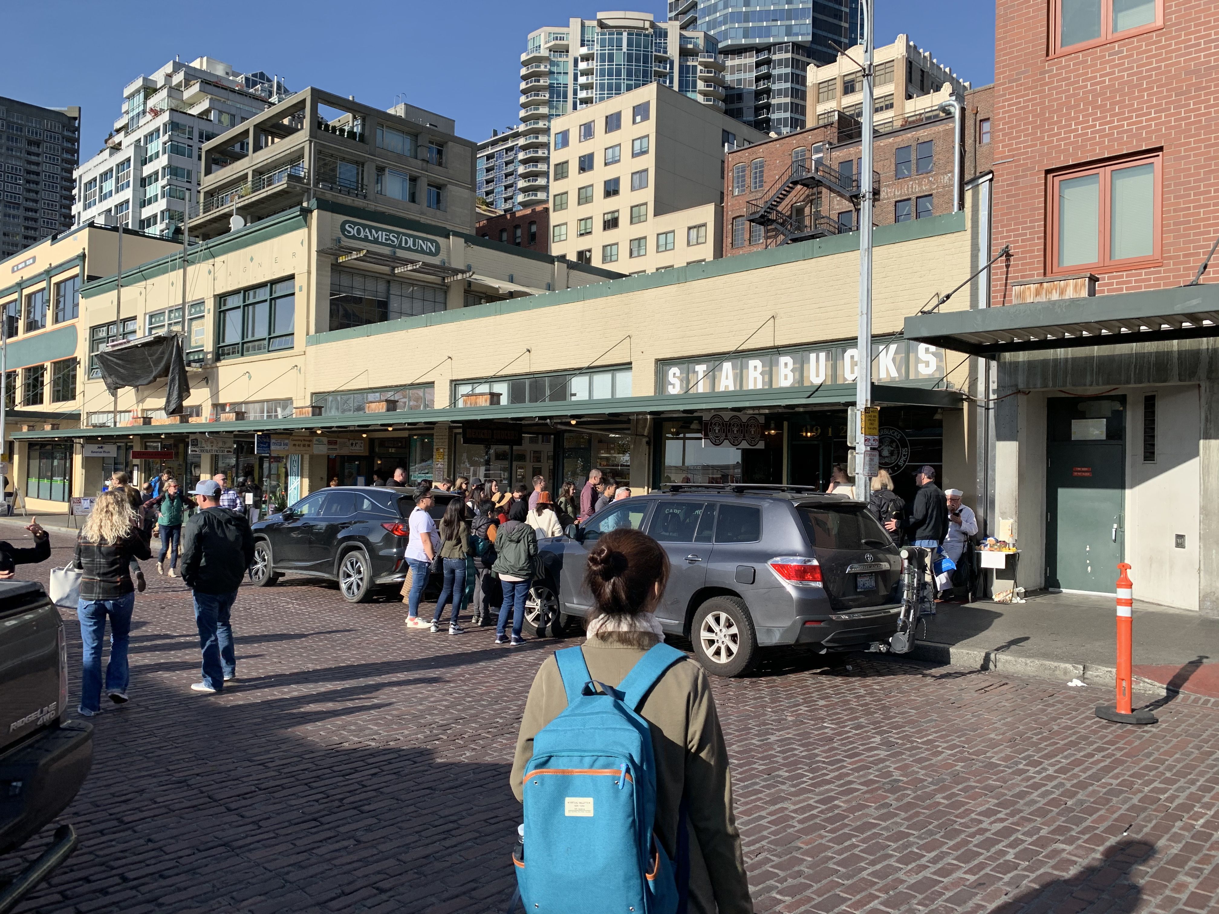 星巴克創始店的位置剛好位於派克市場文創攤位的對面,也是一間一眼就讓人認出的熱門景點,出國去玩跟著人潮走準沒錯。這次打算買幾個草創雙蛇海妖女的圖樣馬克杯回台灣當紀念品,聽說只有在這一間星巴克才買的到喔!