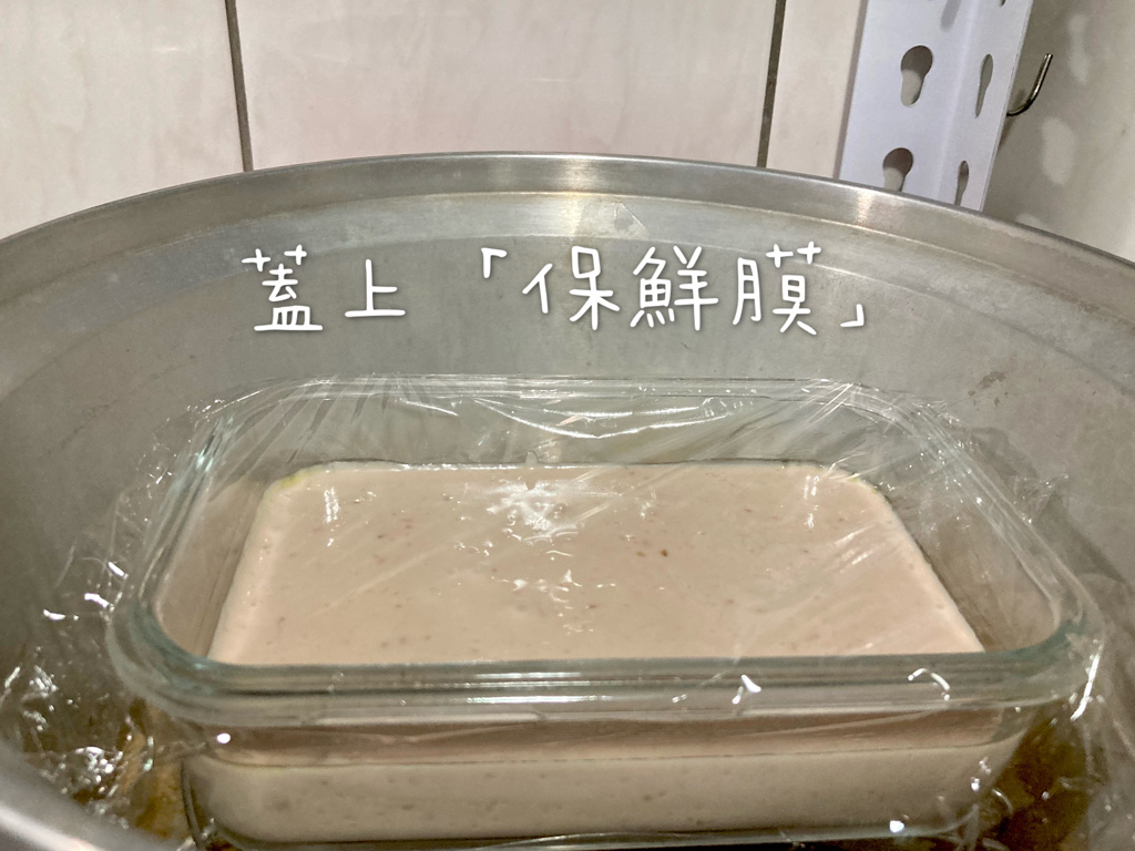 | 6、放入電鍋,蓋上保鮮膜防止水蒸氣滴在表面上。 |