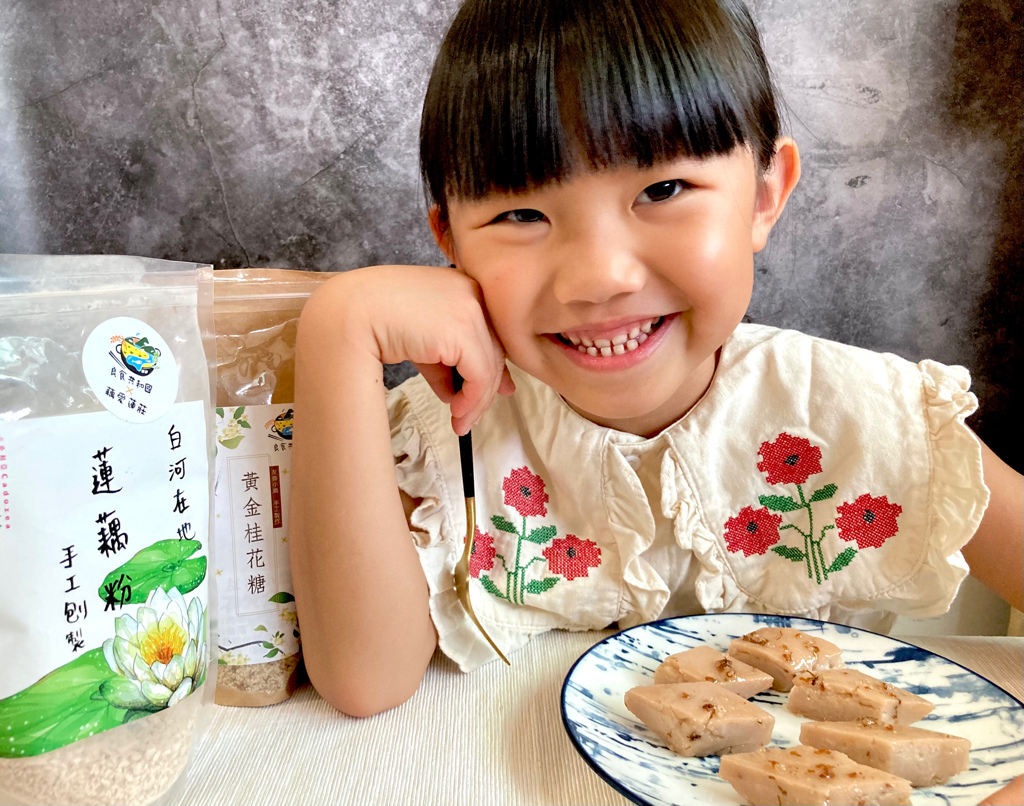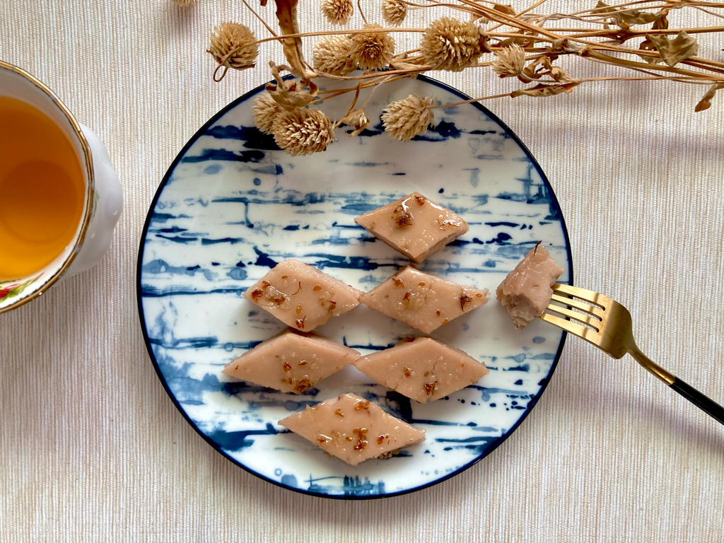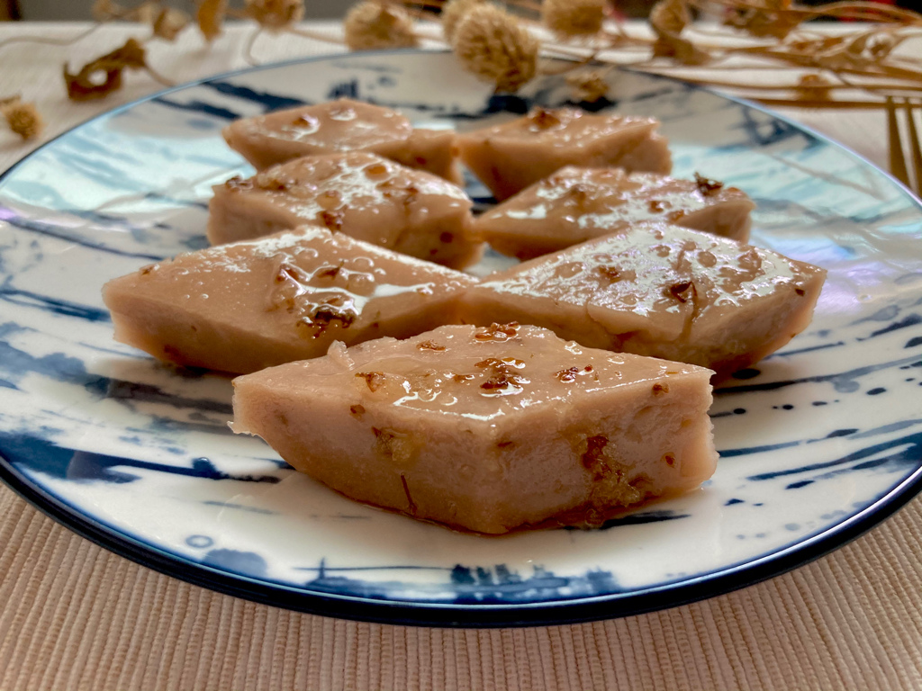 媽咪作的藕粉桂花糖糕嘗起來口感軟Q,比起古早味的甜粿再柔軟的口感,咀嚼的時候齒頰留有桂花清香和蓮藕香,還有不黏牙,很適合當長輩休憩閒聊泡茶的小點心。